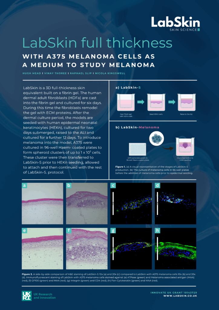 This poster presents LabSkin’s latest work using our 3D full-thickness skin equivalent as a platform to study melanoma progression. Built on a fibrin gel, LabSkin incorporates human dermal adult fibroblasts (HDFa) and human epidermal neonatal keratinocytes (HEKn) cultured through a staged process to recreate a physiologically relevant skin environment. To model melanoma, A375 spheroid clusters (up to 1 × 10⁵ cells) are formed in Haem-coated plates and integrated into LabSkin prior to keratinocyte seeding. This approach enables researchers to investigate melanoma behaviour within a controlled, tissue-realistic system, supporting more predictive and ethical preclinical testing.