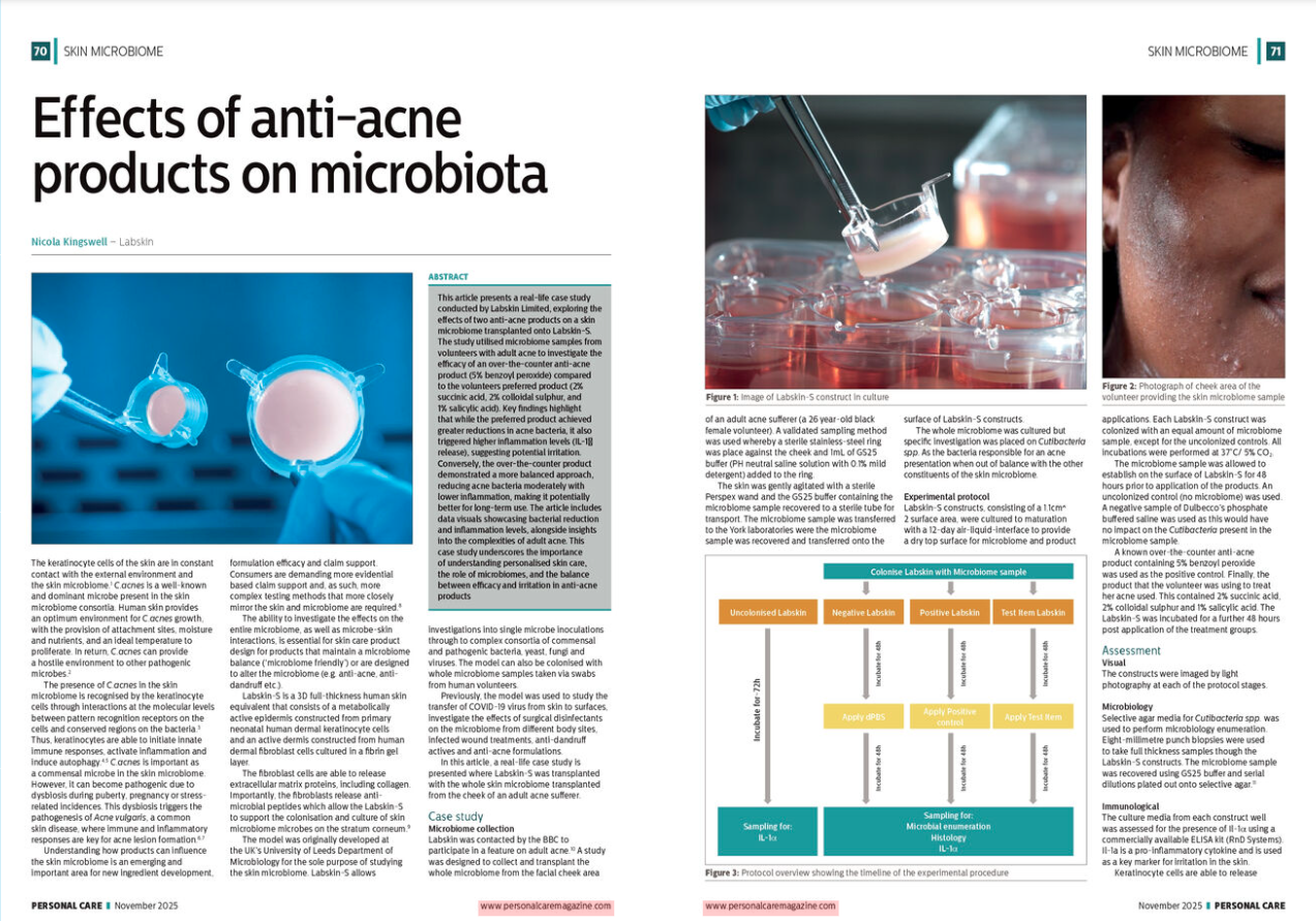 Labskin Limited is proud to be featured in Personal Care magazine with a case study exploring the effects of anti-acne products on the skin microbiome using Labskin-S. Led by Dr Nicola Kingswell, the study highlights how different products can reduce acne bacteria while balancing inflammation, providing valuable insights for microbiome-informed skincare development.